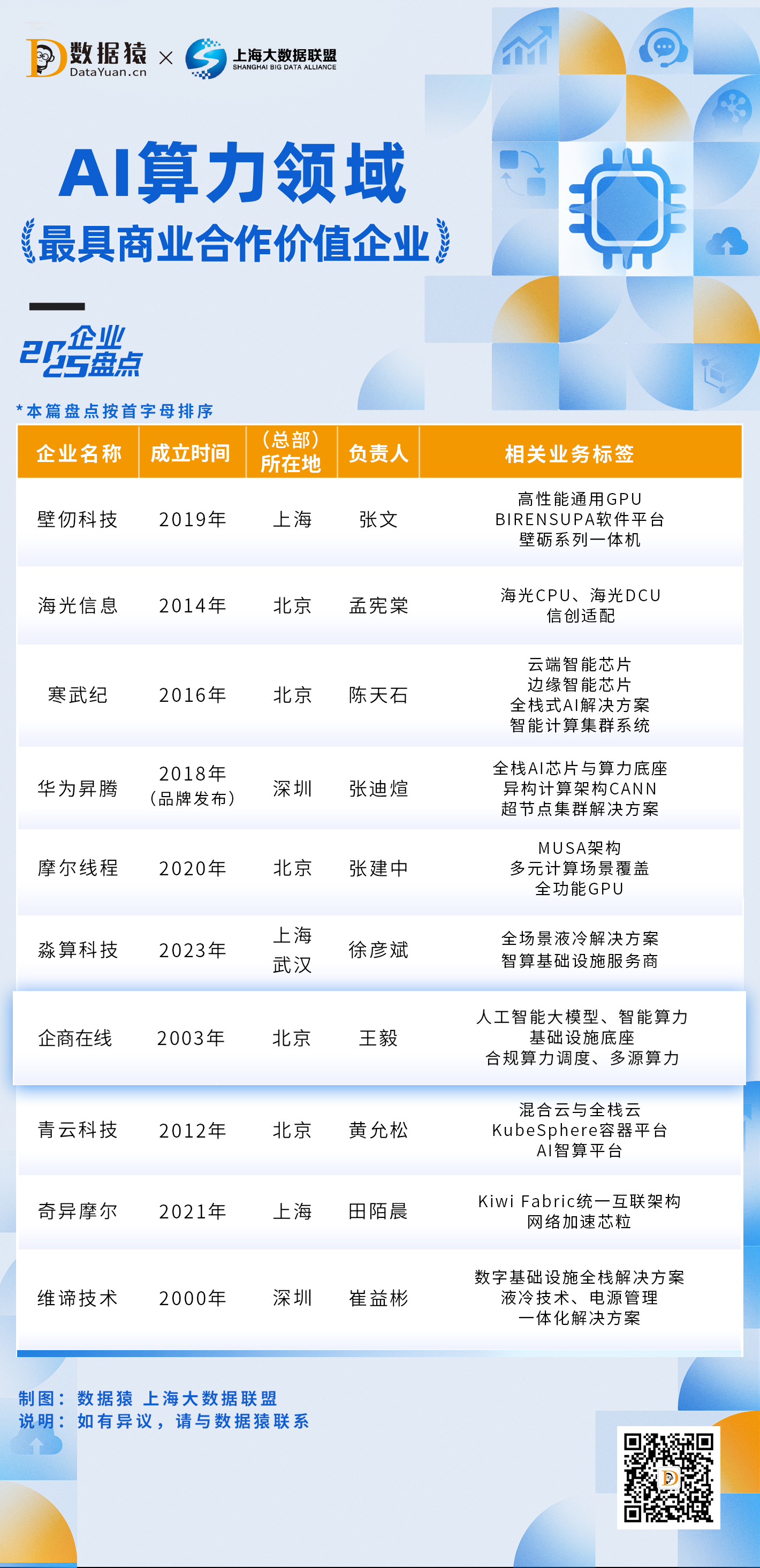 AI智算正成为驱动数字经济的核心引擎。近日,在国内权威的大数据与企业应用服务平台数据猿最新发布的《2025中国AI算力领域最具商业合作价值企业盘点》中,企商在线凭借其"数算融合"的硬核实力,成功入选行业标杆企业榜单。