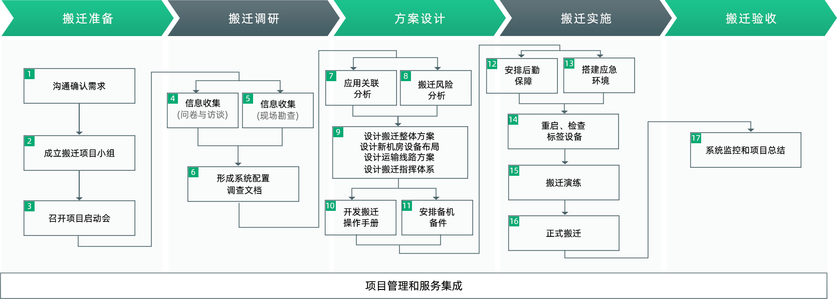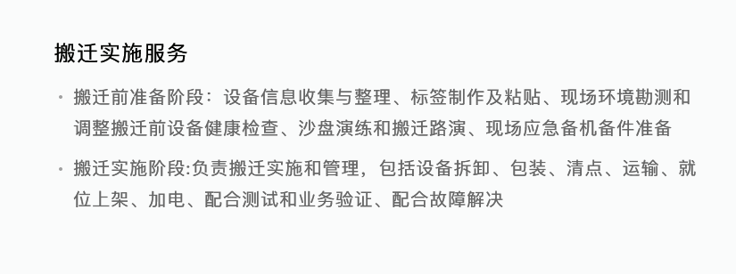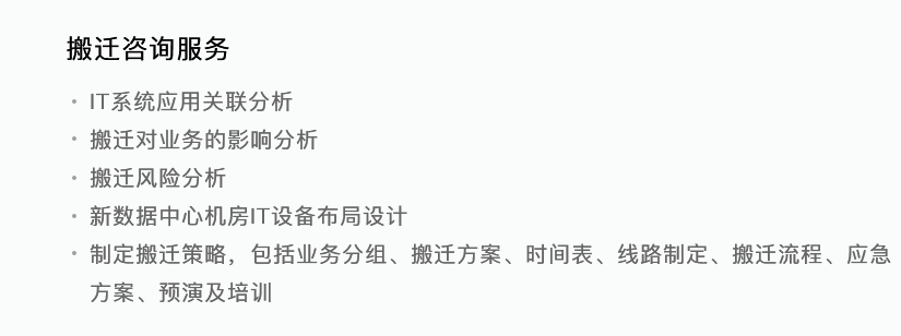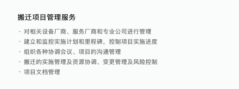 一站式数据中心搬迁服务,涵盖项目咨询、项目管理与项目实施,确保搬迁过程规划周密、执行严谨、风险可控,保障数据与系统的安全性和可用性,最小化搬迁对业务的影响。