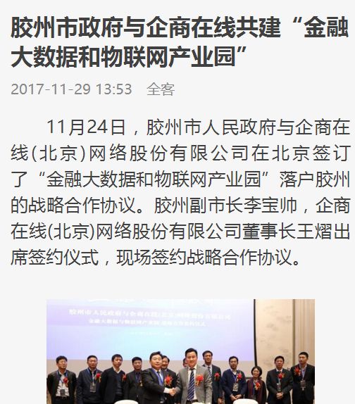 2017年胶州市人民政府与企商在线签订“金融大数据和物联网产业园”战略合作协议,全省首家面向金融大数据和物联网的专业园区落户胶州。产业园通过聚焦服务金融行业和物联网产业,实现跨行业大数据融合,促进航空物流、智能制造等大数据产业发展,同时将重点支撑胶州智慧城市建设,提高群众幸福指数。