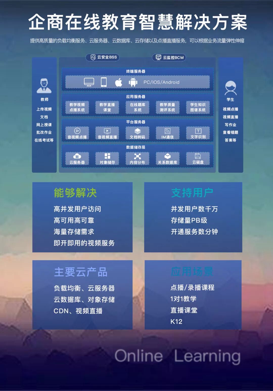 企商在线为在线教育平台提供的教育云数据中心解决方案,具备以下优势
