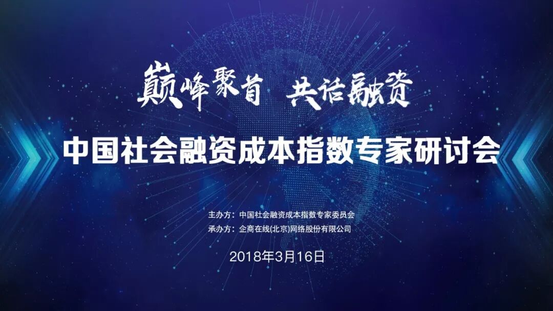 2018年3月16日,由中国社会融资成本指数专家委员会主办,企商在线(北京)网络股份有限公司承办的“中国社会融资成本指数专家研讨会”在北京举行。作为中国社会融资成本指数报告发布后的首次专家聚首,本次研讨会以“社会融资成本指数的未来发展探索”为主题,中国社会融资成本指数委员会、中国光大银行、贵阳银行、中航证券、江海证券、生华股份、美国世纪投资、浙江厚信资产、北京中泰金控、北京国兵天元投资管理有限公司、万瑞租赁、富安小额贷款、舜盛资产等金融行业大咖共襄盛宴。